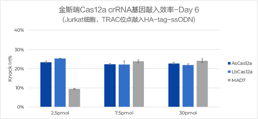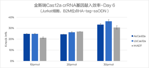 实验结果: 使用黄金城集团Cas12a crRNA,针对不同酶均可以获得较高的基因敲入效率: