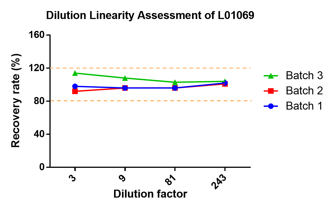 图3. 使用3个批次的L01069测试不同稀释倍数的样本,以评价回收率。结果显示,不同批次试剂盒的回收率均不受稀释倍数影响。