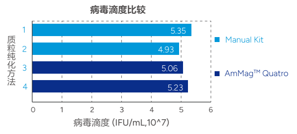 结果显示: 经AmMag™ Quatro 1400 提取的质粒,转染后获得的病毒滴度与对照质粒相当。