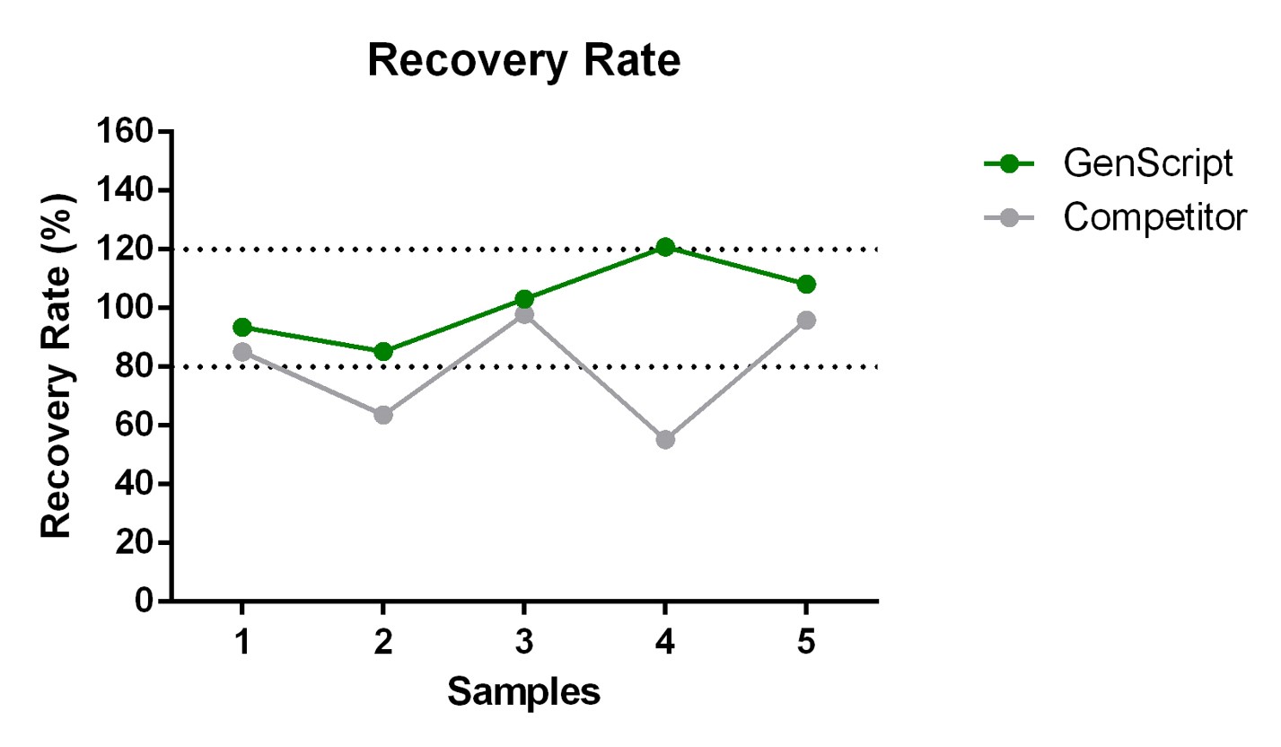 The recovery rates of endotoxin spiked into 5 different biological preparations were evaluated, and the results indicated that the GenScript kit provided the most accurate recovery.