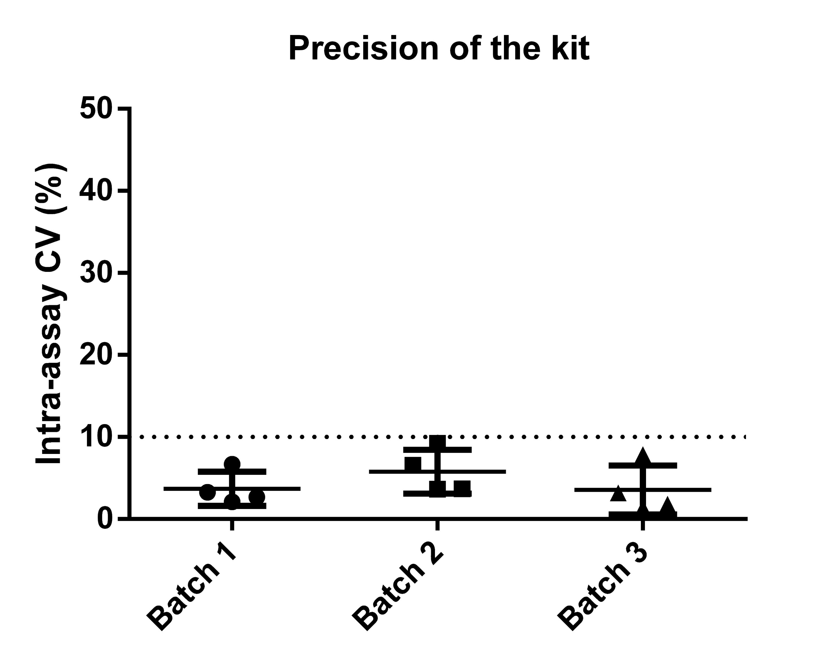 The well-to-well precision across three batches of kits shows a CV<10%.