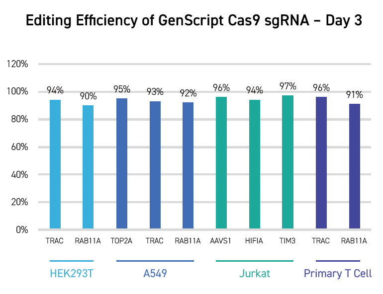 - Cas9 sgRNA在多个细胞多个位点上均有较高的编辑效率,编辑效率高达97%