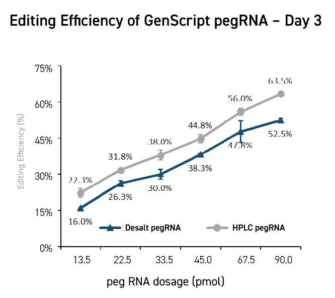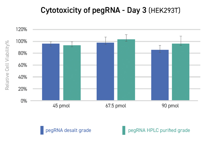 - 脱盐和HPLC级别的pegRNA的细胞毒性均较低,对实验干扰小