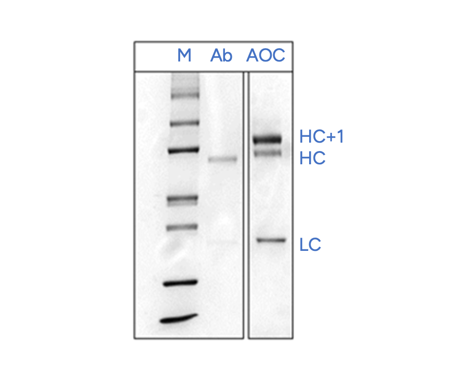 偶联产物在SDS-PAGE检测中解链成轻链 (LC),重链(HC),重链+1个寡核苷酸 (HC+1),检测所得的峰符合DAR1偶联产物解链后的预期